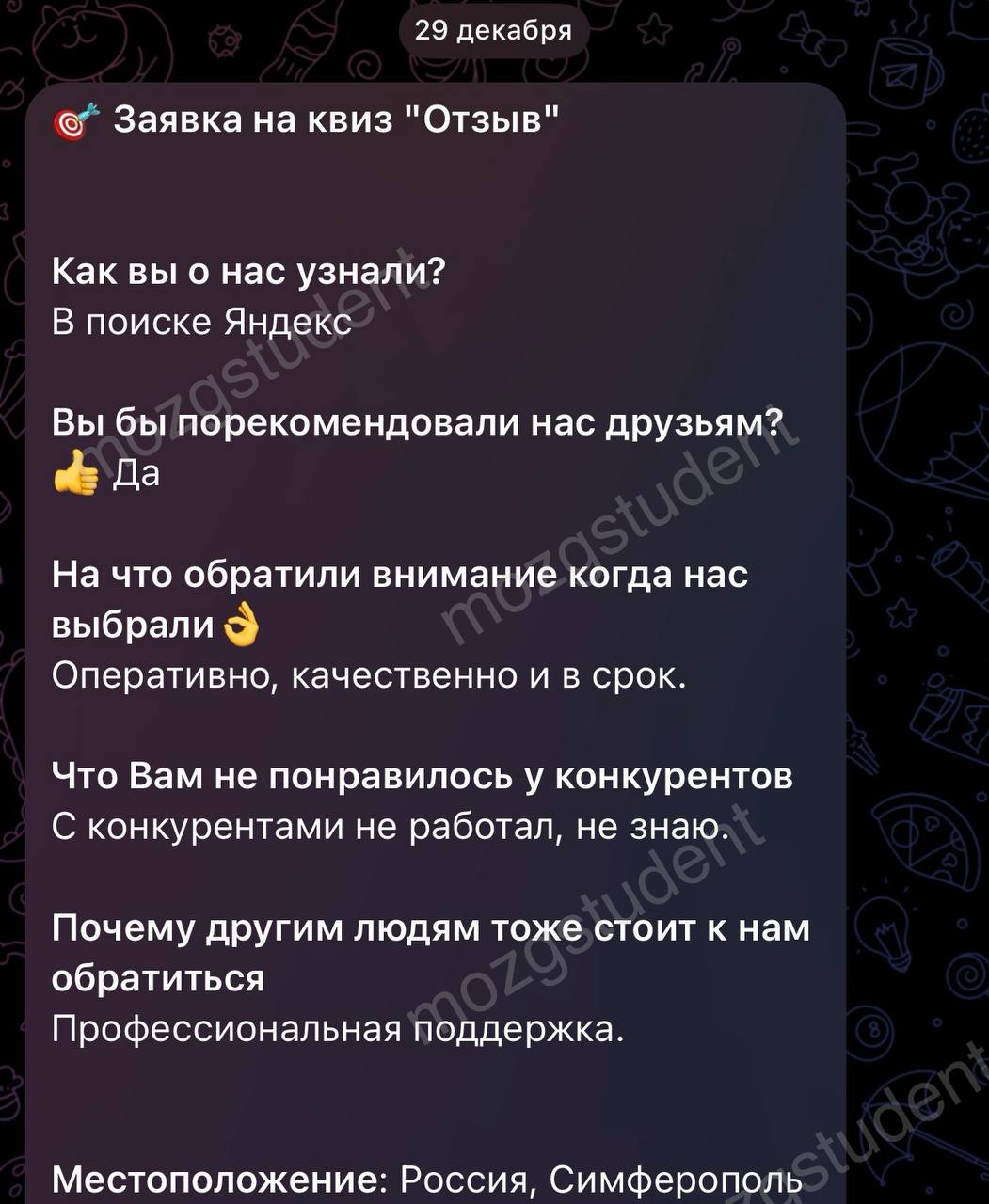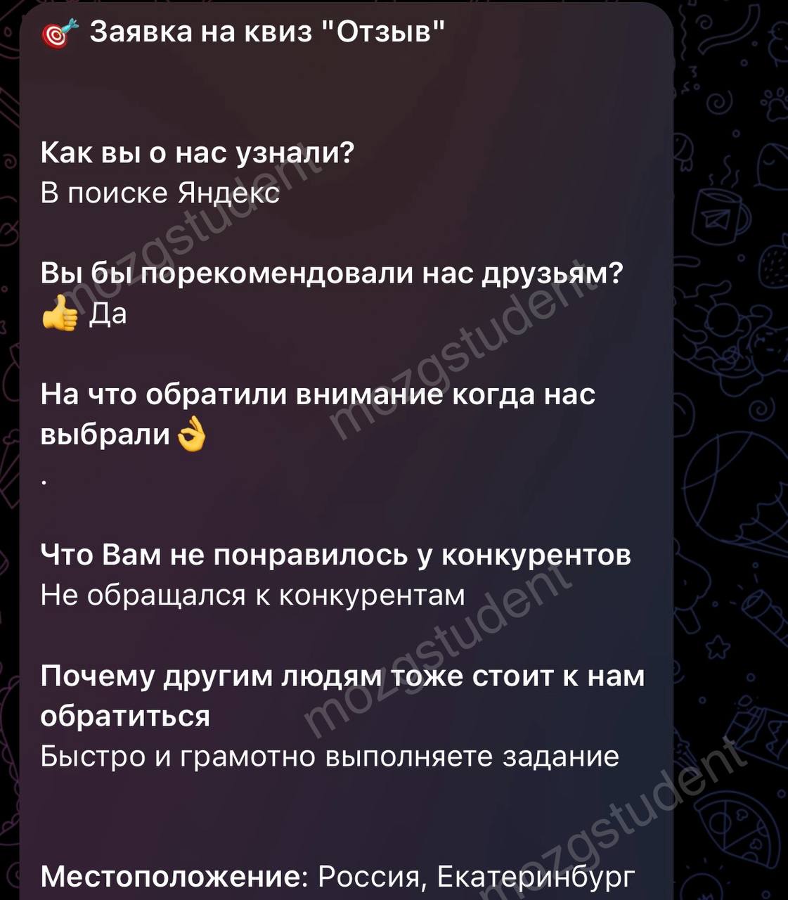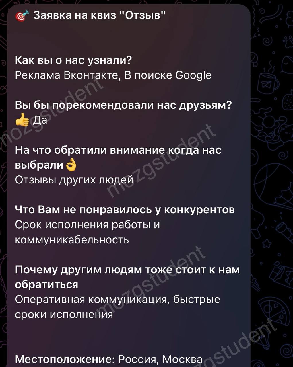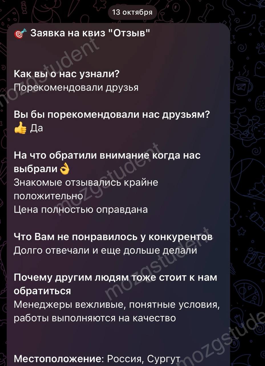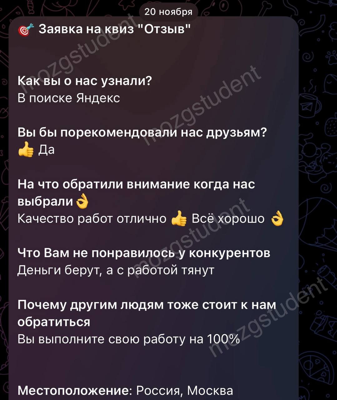 Данный сайт: дочерний проект компании mozgstudent, поэтому опубликованные отзывы содержат названия обоих проектов