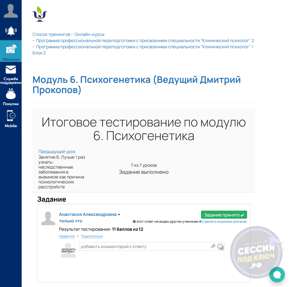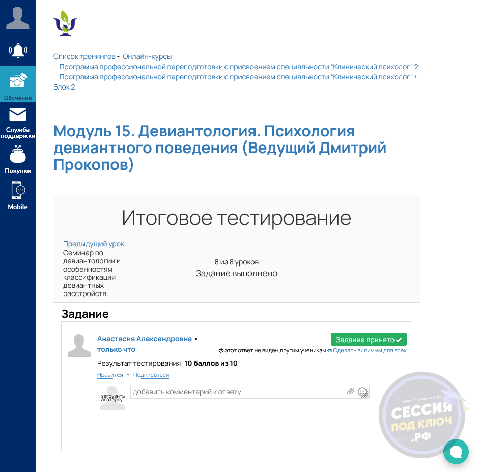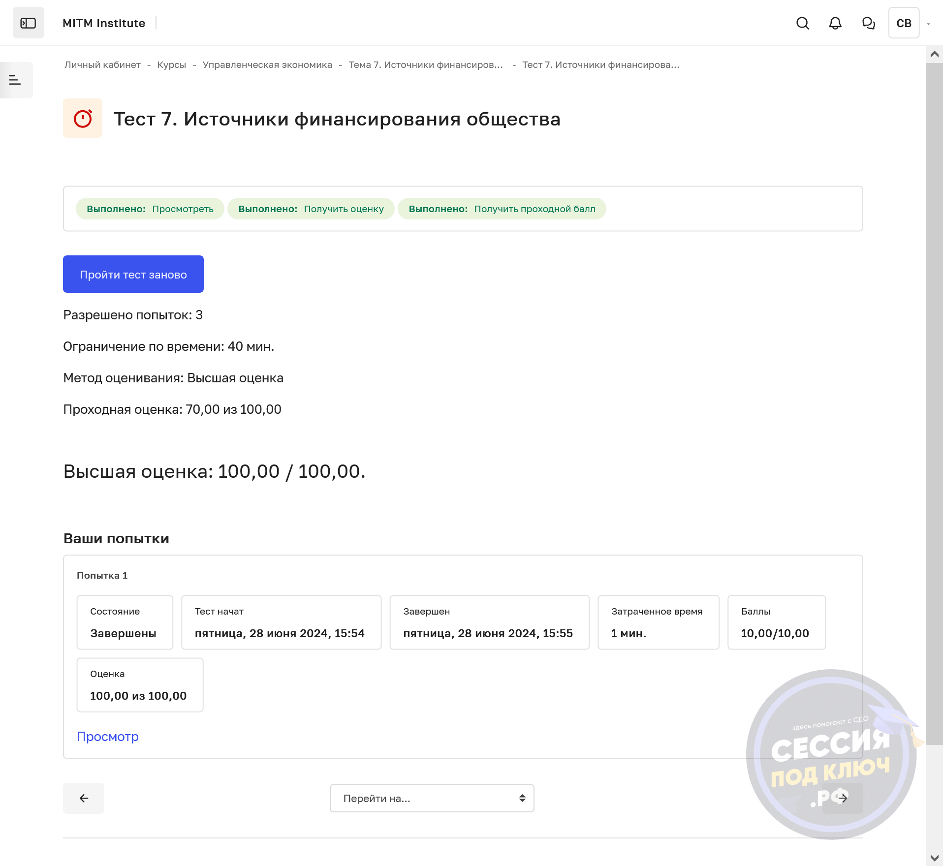 Результат: Тест 7 по управленческой экономике взяли в работу 27.06.2024 и завершили 01.07.2024, после чего в заказе сохранился загруженный результат.