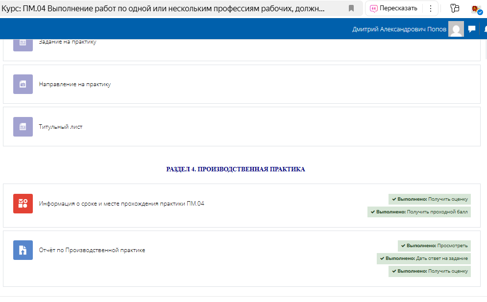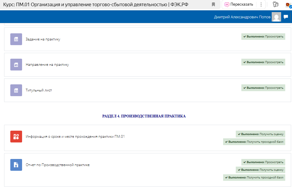 Нужно было подготовить материалы по следующим дисциплинам: ПРОИЗВОДСТВЕННАЯ ПРАКТИКА ПО ПРОФЕССИОНАЛЬНОМУ МОДУЛЮ - ПМ.01 «Организация и управление торгово-сбытовой деятельностью» и ПРОИЗВОДСТВЕННАЯ ПРАКТИКА ПО ПРОФЕССИОНАЛЬНОМУ МОДУЛЮ - ПМ.04 «Выполнение работ по одной или нескольким профессиям рабочих, должностям служащих» (2 недели).